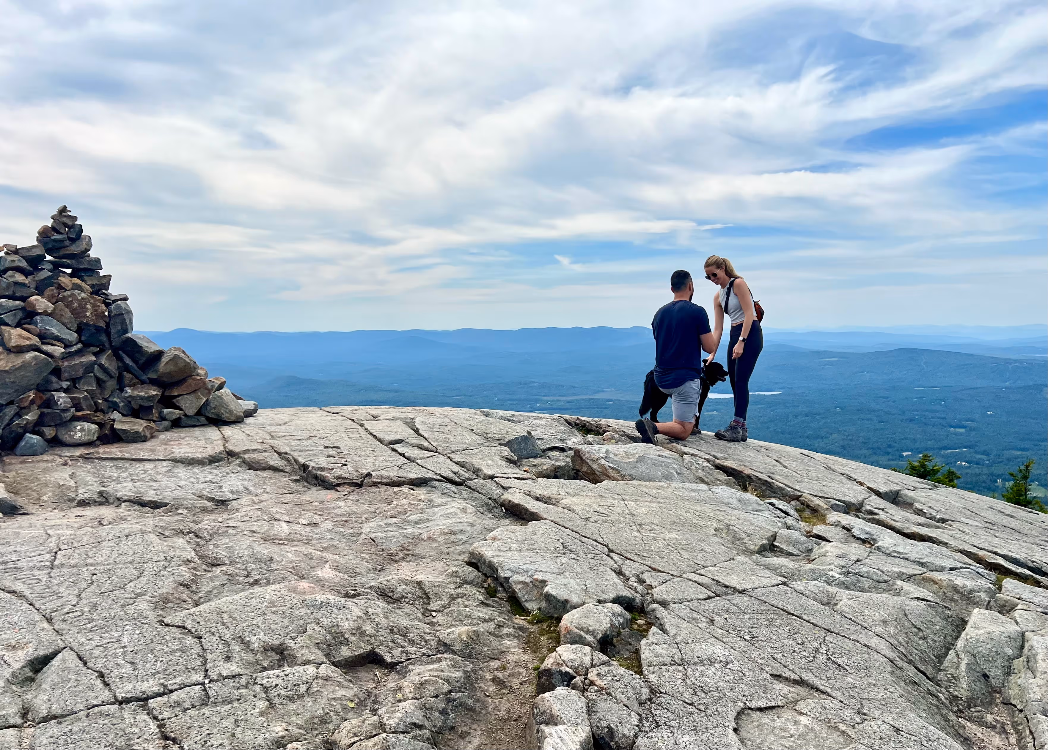 Brian planned a romantic proposal on a scenic hike to Mount Kearsarge in New Hampshire, with their beloved dog, Poppy, by their side. At the summit, Brian’s brother was positioned to capture the special moment, made even more memorable with guidance from our designer to perfectly stage the scene.
