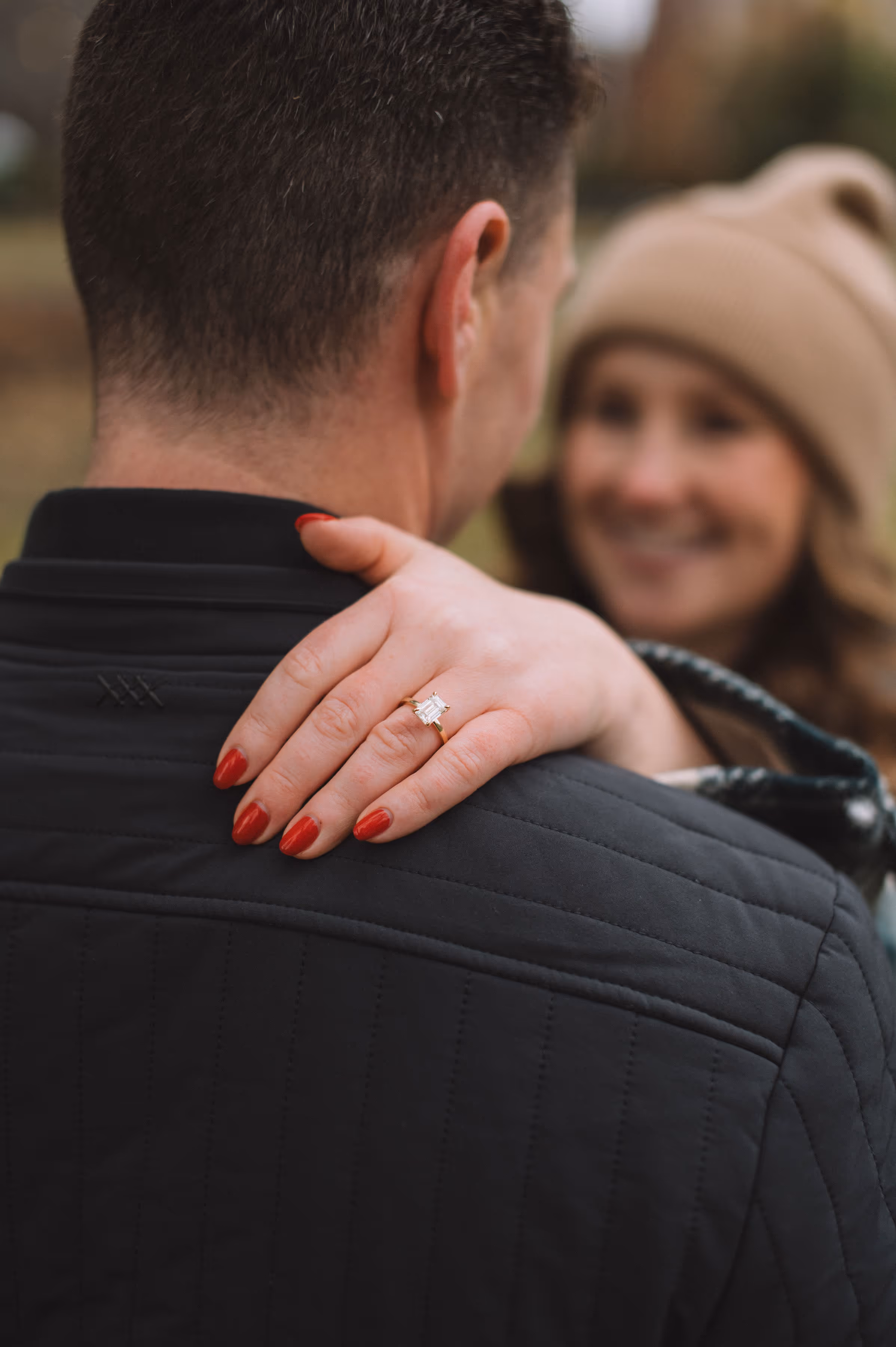 After dating for several years, Matt surprised Bridget with a private design appointment at Hannah Florman for her birthday, knowing her love for our work. We transformed our private studio, The Brownstone, into an intimate, celebratory space complete with champagne and a curated selection of emerald-cut diamonds. To keep the proposal and the final ring a surprise, Matt worked closely with our designer, Danielle, to perfect the design: a breathtaking yellow gold solitaire featuring a stunning emerald-cut diamond.