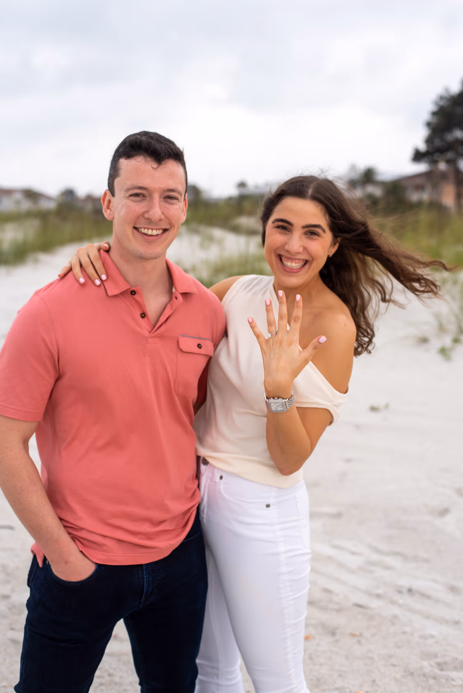 A: “My family had planned a vacation to Indian shores Florida which, coincidentally, was near Veronica’s friends and family. She grew up in Tampa, Florida which is 35 minutes from Indian shores beach. This became the perfect opportunity to have everyone in one place. Once the plans were set, I started the design process with Danielle for the engagement ring. The cover story was that we had dinner plans with family later that night but would first grab a cocktail. It took some convincing to go outside because of the weather. But finally I was able to get Veronica down to the beach. I took her hands and started talking to her about our life and she slowly started to realize what was happening. I proposed and the photographer, Kyle Flemming, captured it all for us. After I proposed, she thought it was still just a dinner with her parents and my family. We drove over to what she thought was the restaurant but we pulled up to the hotel and she seemed confused. We got upstairs to the rooftop and everyone shouted surprise.