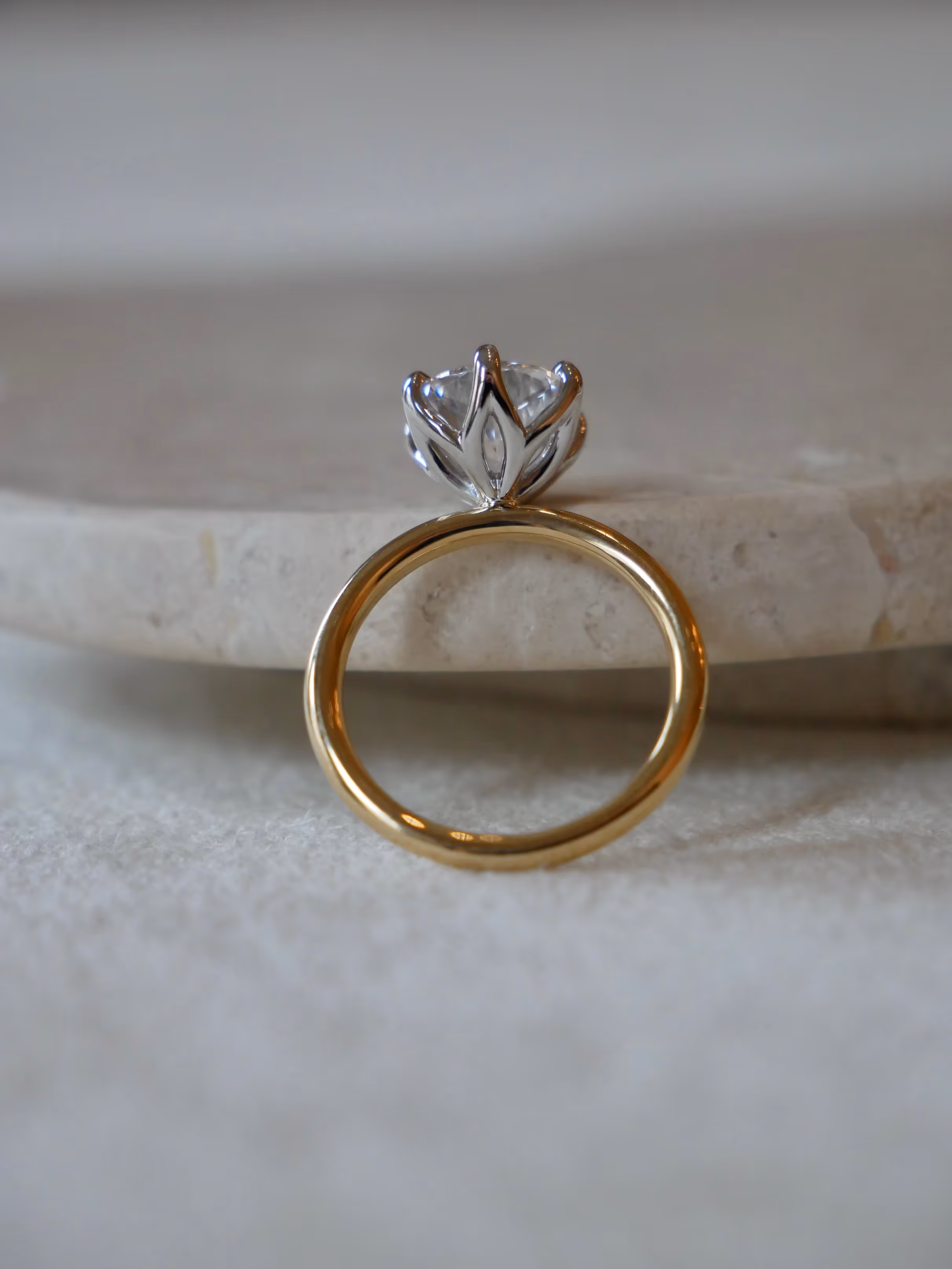 Basket Design – The basket setting is a pivotal design element that not only secures the diamond but also adds an elegant touch to the ring’s overall appearance. The basket refers to the metal framework that holds the diamond in place, often shaped like a small basket or open setting beneath the stone. This design allows the diamond to sit higher above the band, creating a graceful, elevated look that enhances its brilliance by allowing more light to pass through from all angles. Depending on the style, the basket can be simple and understated, or it can be more intricate, featuring decorative details like filigree, arches, or additional diamond accents. Some basket settings also incorporate side detailing, offering a vintage or custom feel. This setting can add not only a sense of security but also a unique personality to the piece, influencing the ring’s balance and silhouette.