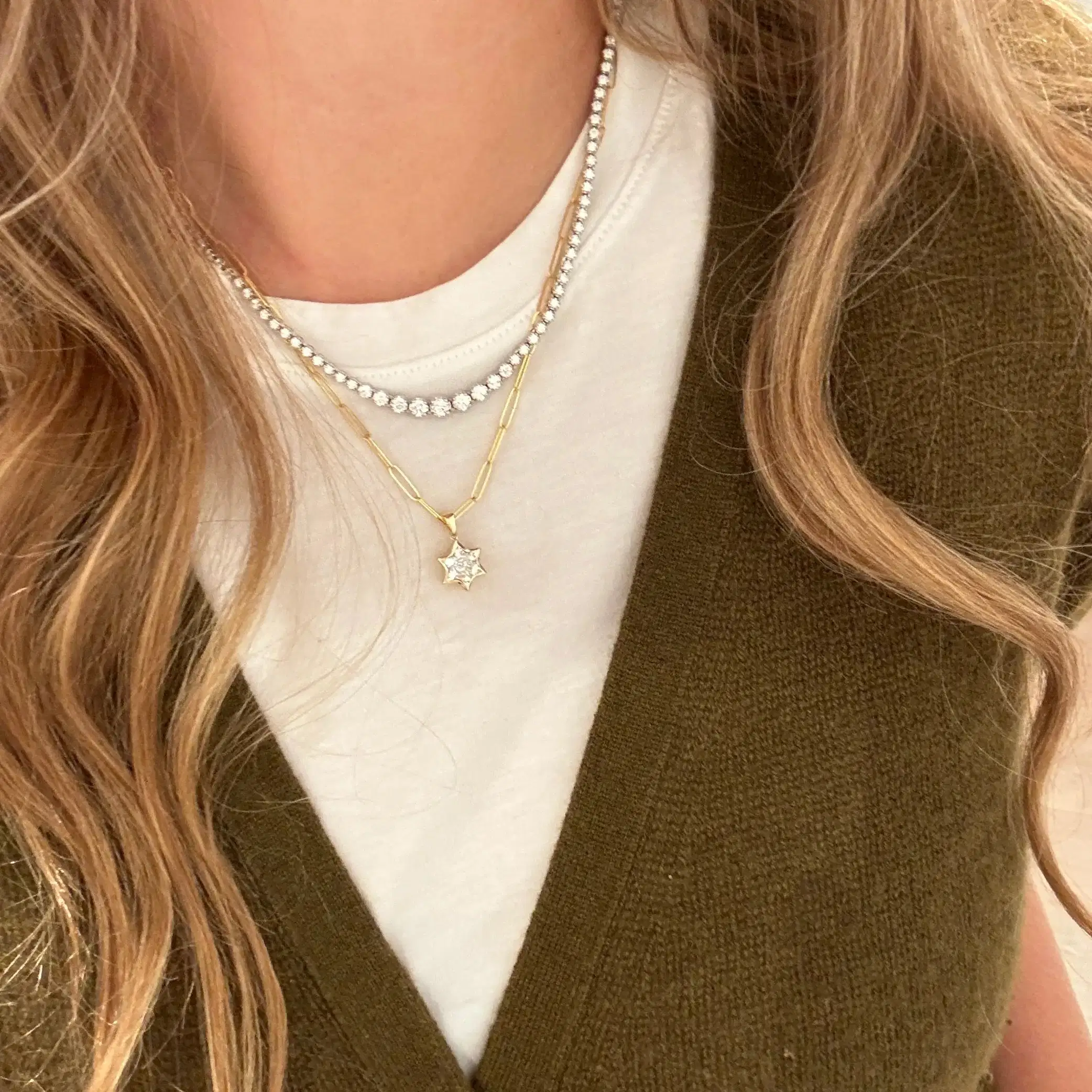 A true Hannah Florman classic — this graduated three-prong tennis necklace embodies timeless elegance with modern versatility. Designed to transition effortlessly from everyday wear to evening occasions, it’s the piece you’ll reach for again and again. Available in two sizes to achieve your perfect look.